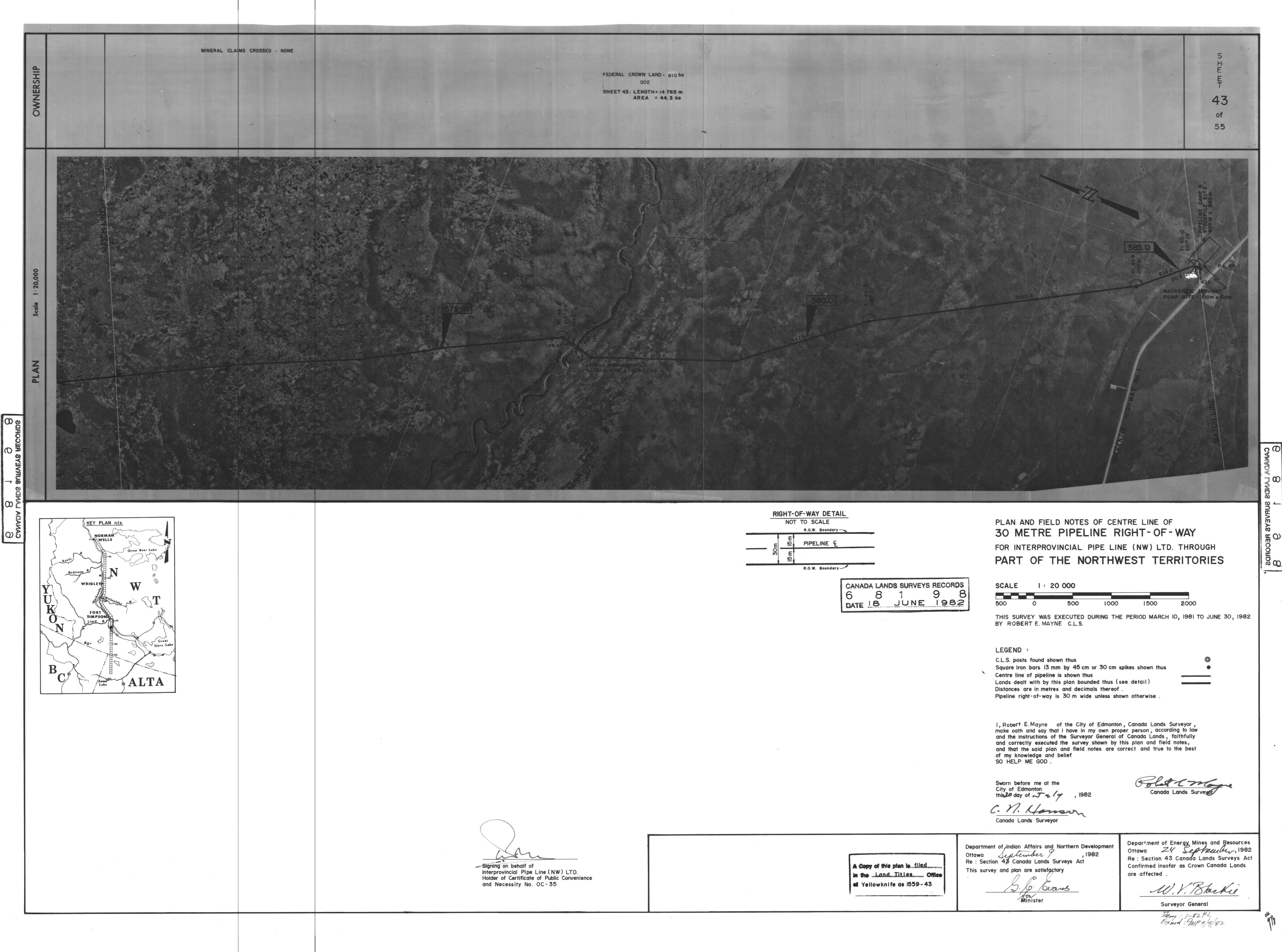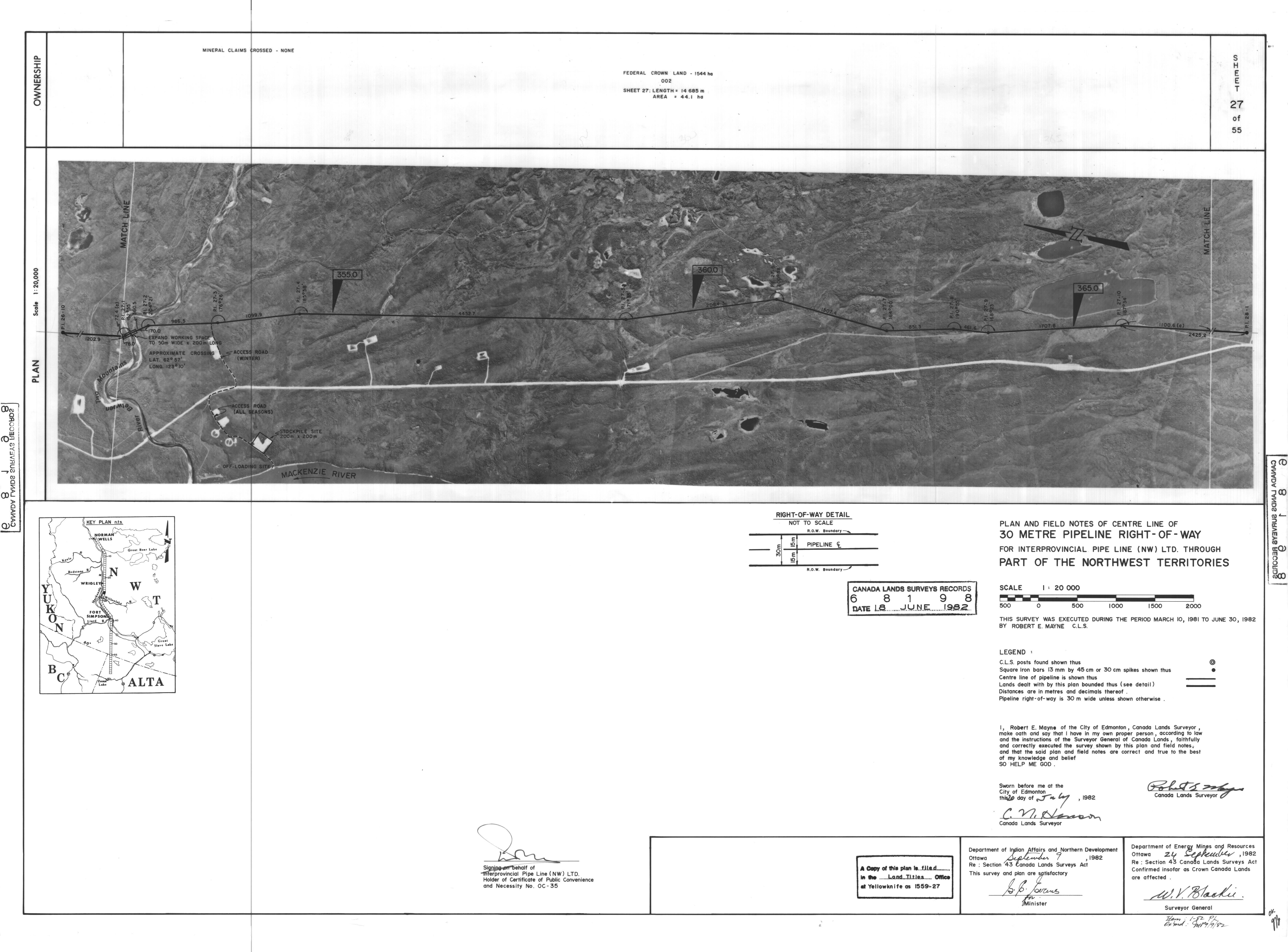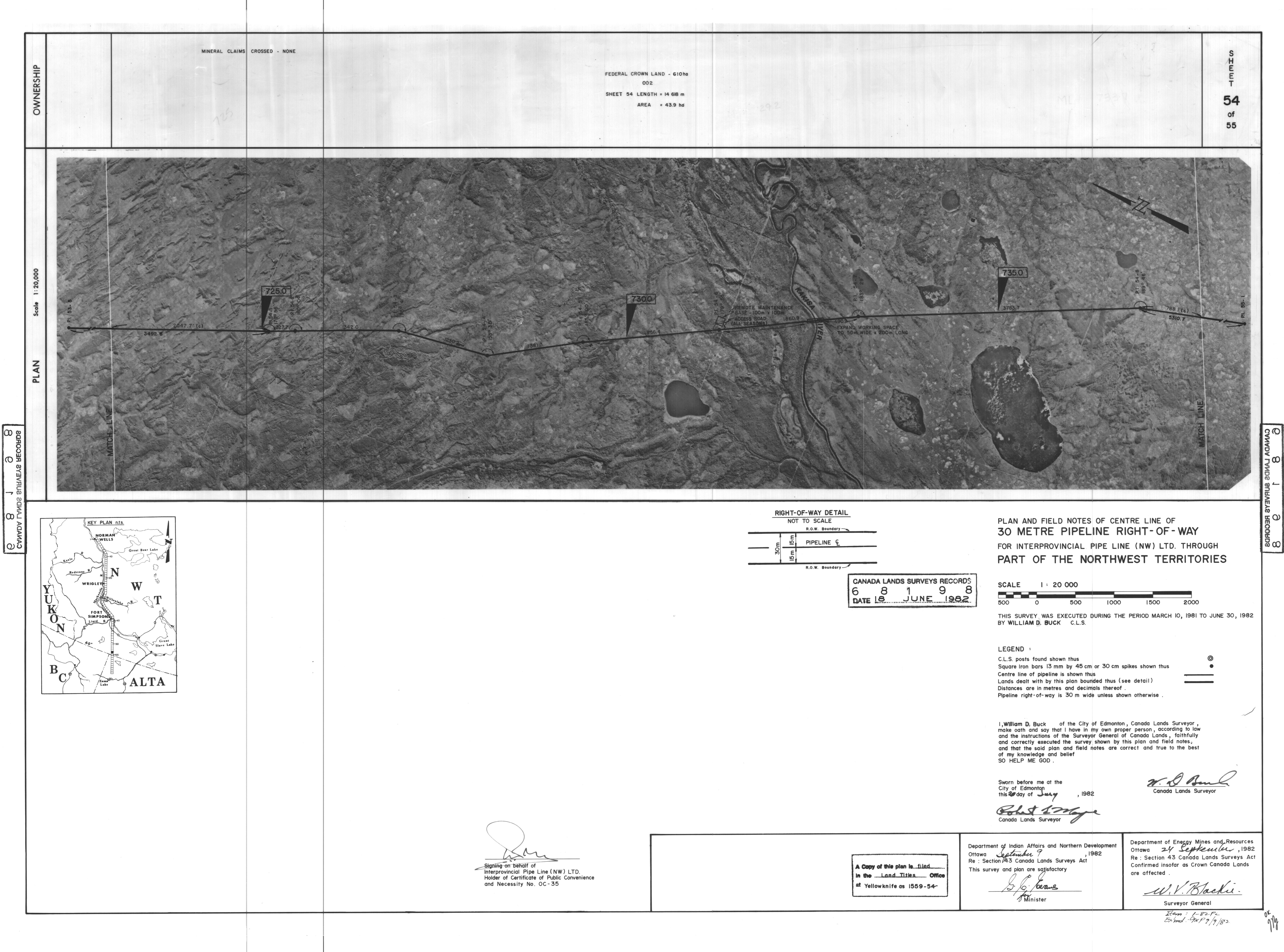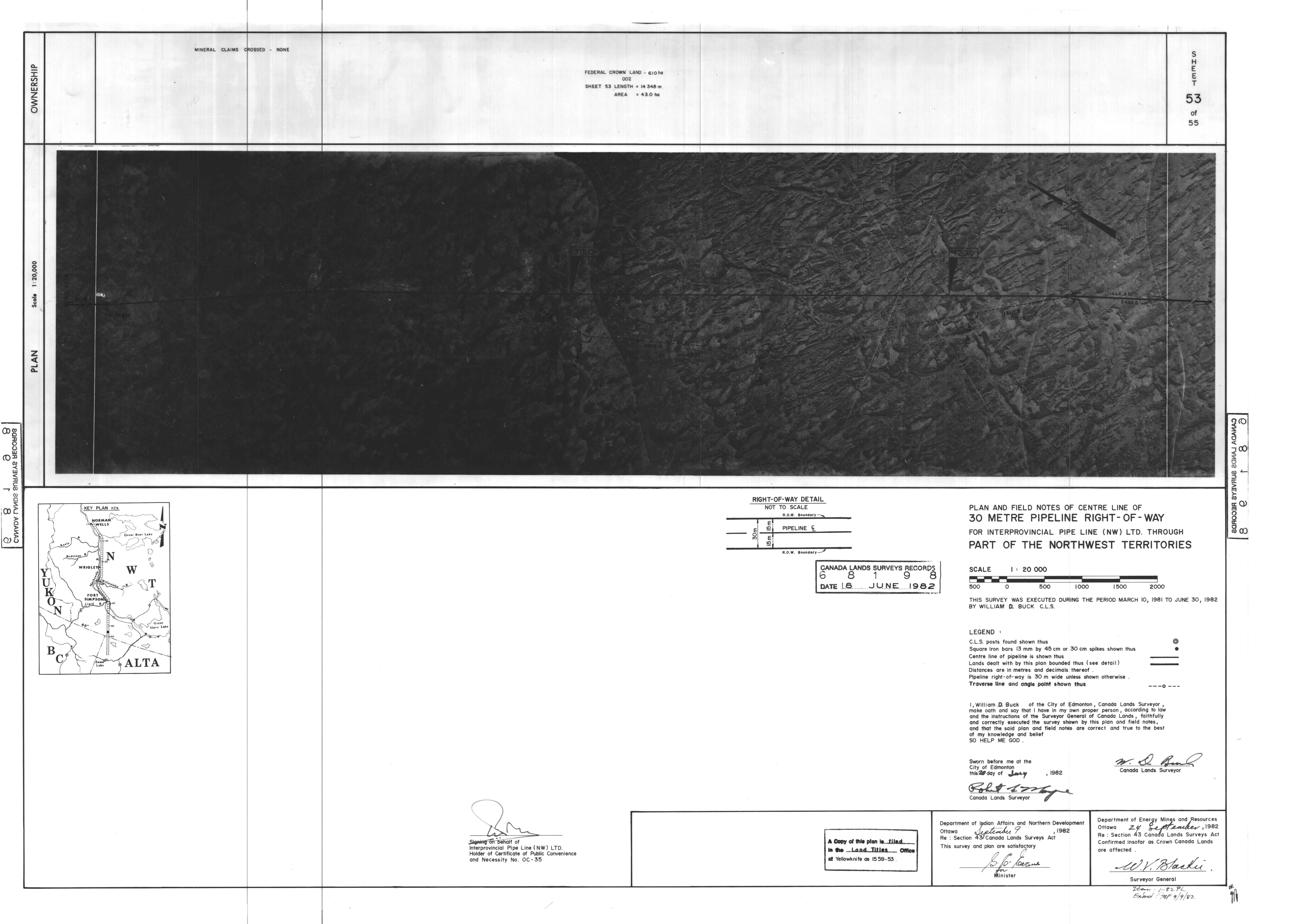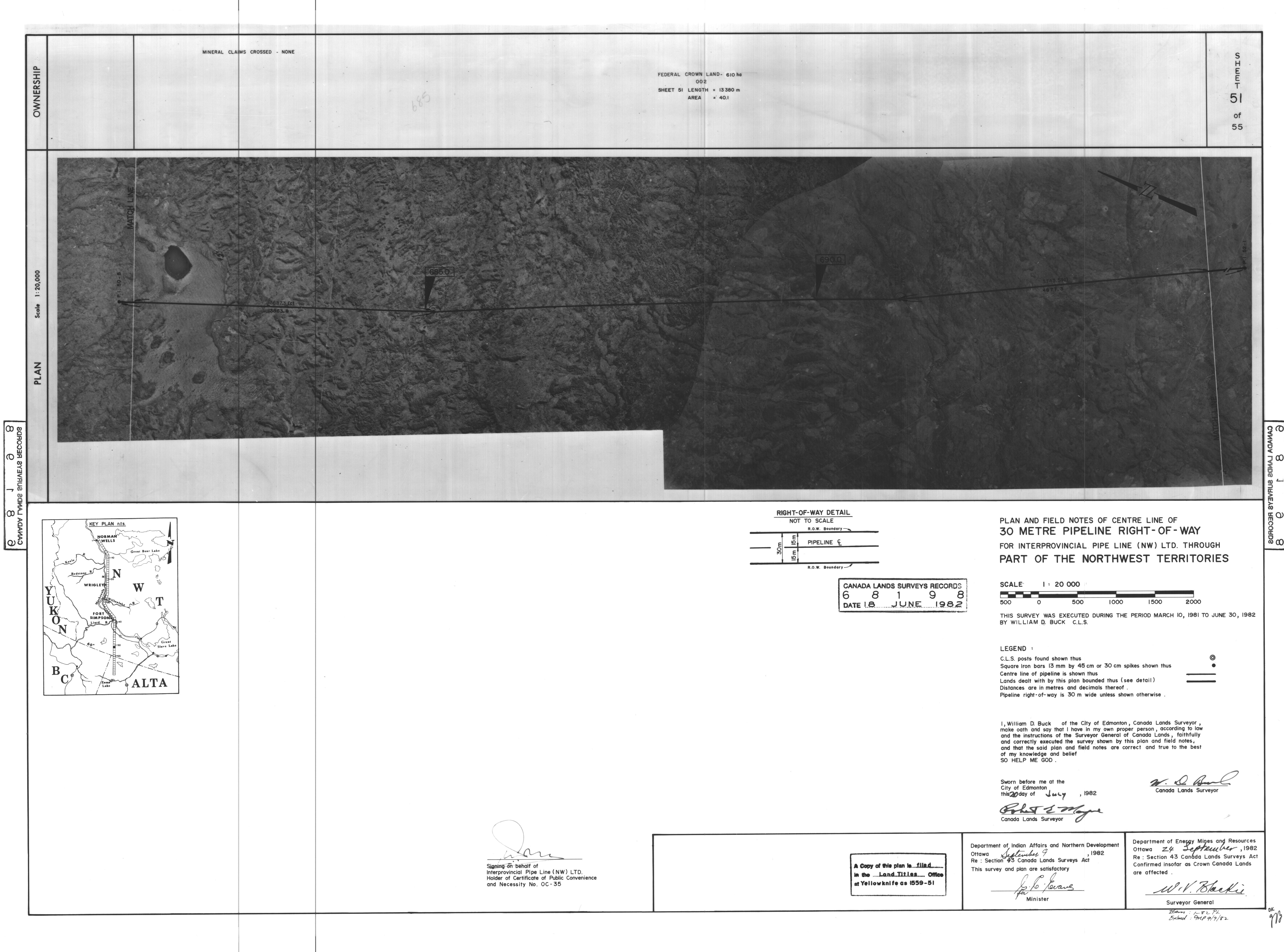 | Title | PLAN AND FIELD NOTES OF THE CENTRE LINE OF 30 METRE PIPELINE RIGHT-OF-WAY FOR INTERPROVINCIAL PIPE LINE (NW) LTD. THROUGH PART OF THE NORTHWEST TERRITORIES, 55 SHEETS (eng; CAN) |