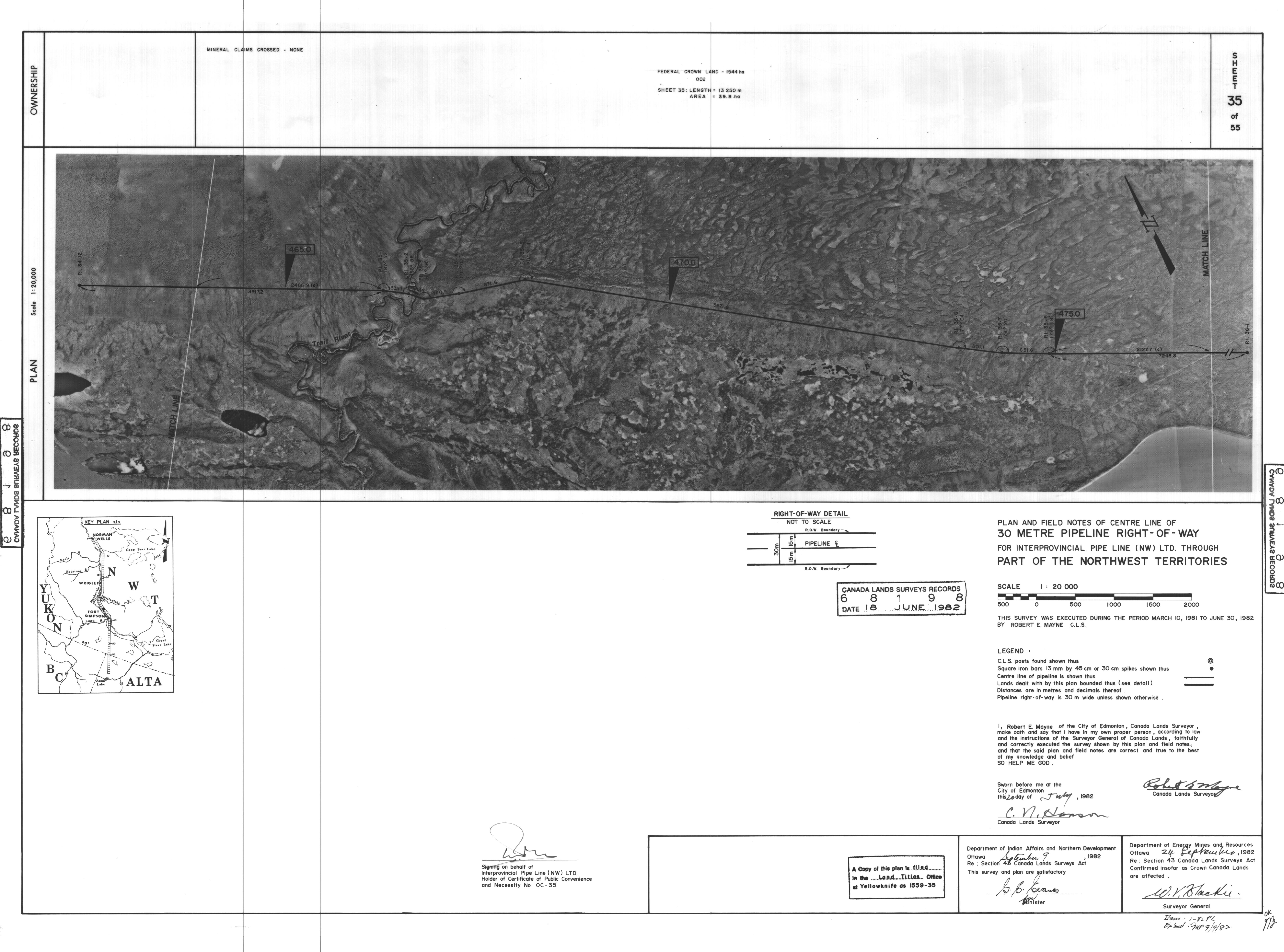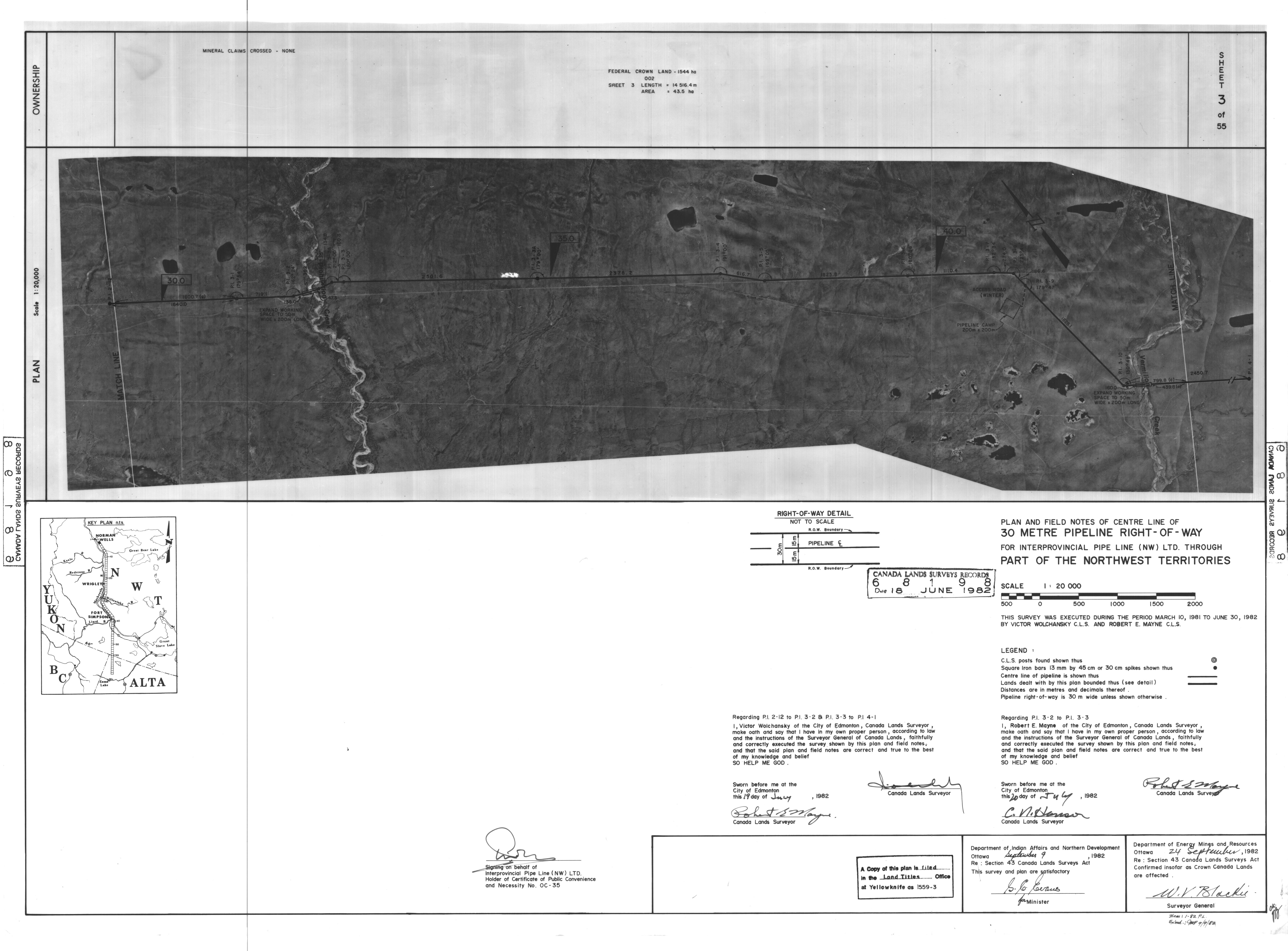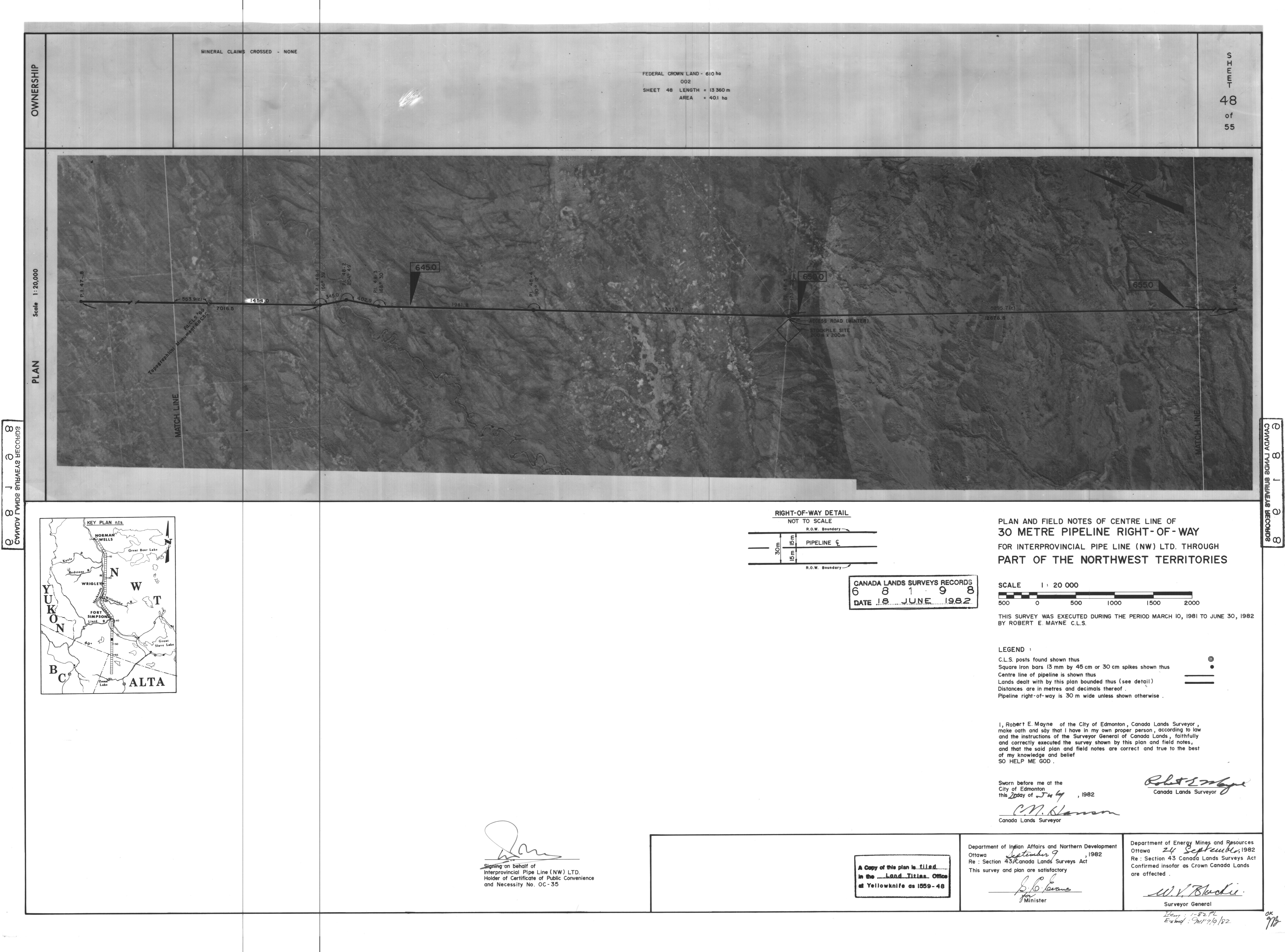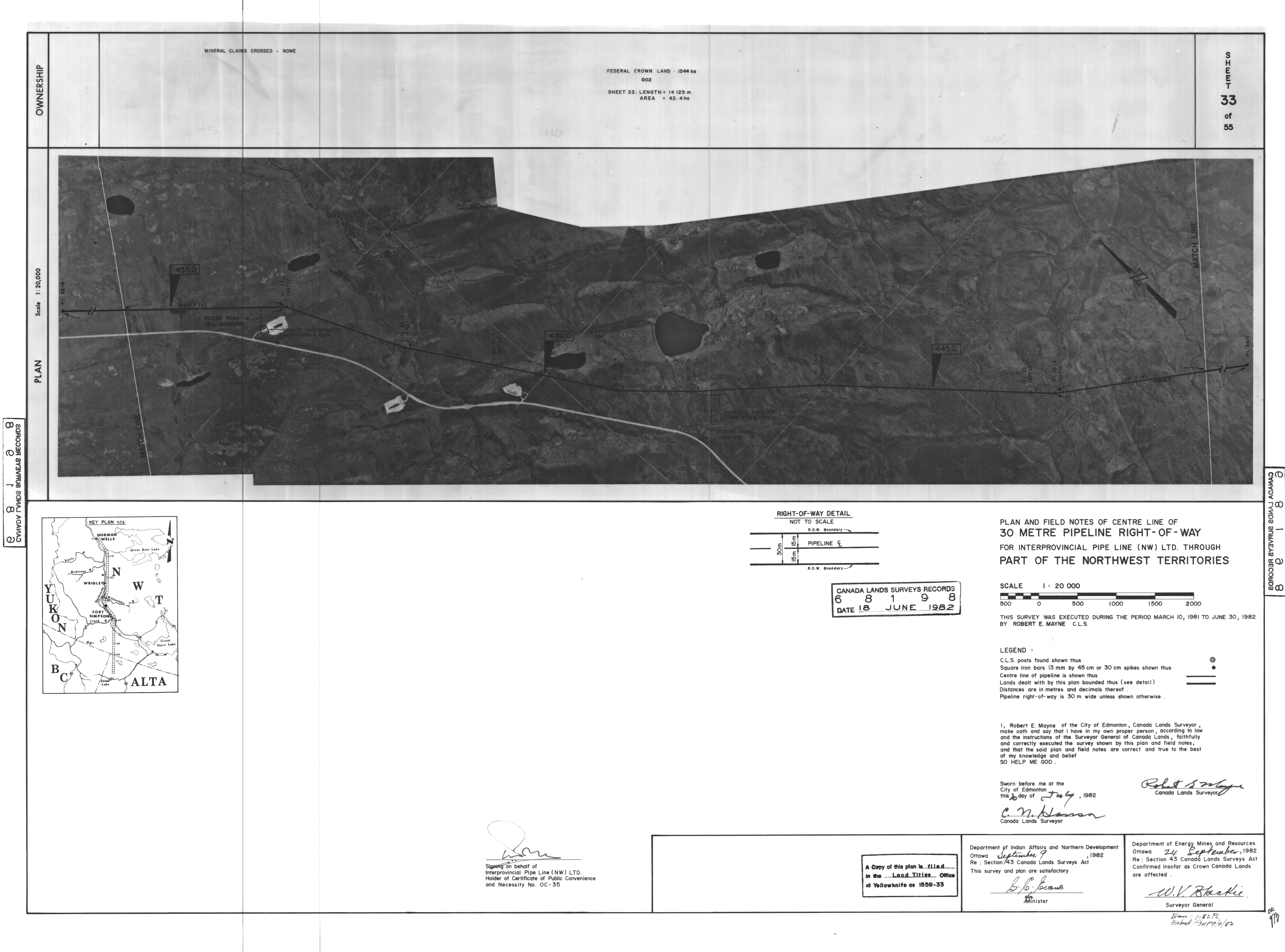 | Title | PLAN AND FIELD NOTES OF THE CENTRE LINE OF 30 METRE PIPELINE RIGHT-OF-WAY FOR INTERPROVINCIAL PIPE LINE (NW) LTD. THROUGH PART OF THE NORTHWEST TERRITORIES, 55 SHEETS (eng; CAN) |